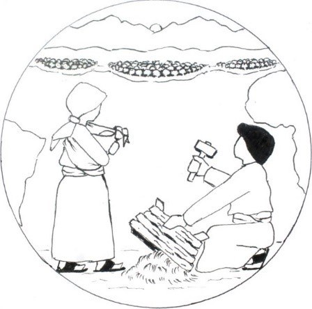 This first drawing is an example of what the cards look like before being colored. It illustrates Mary holding Jesus securely in a Subanen-style sling while Joseph repairs the manger. The idea comes from how Subanens constantly repair their tools, belongings and homes.